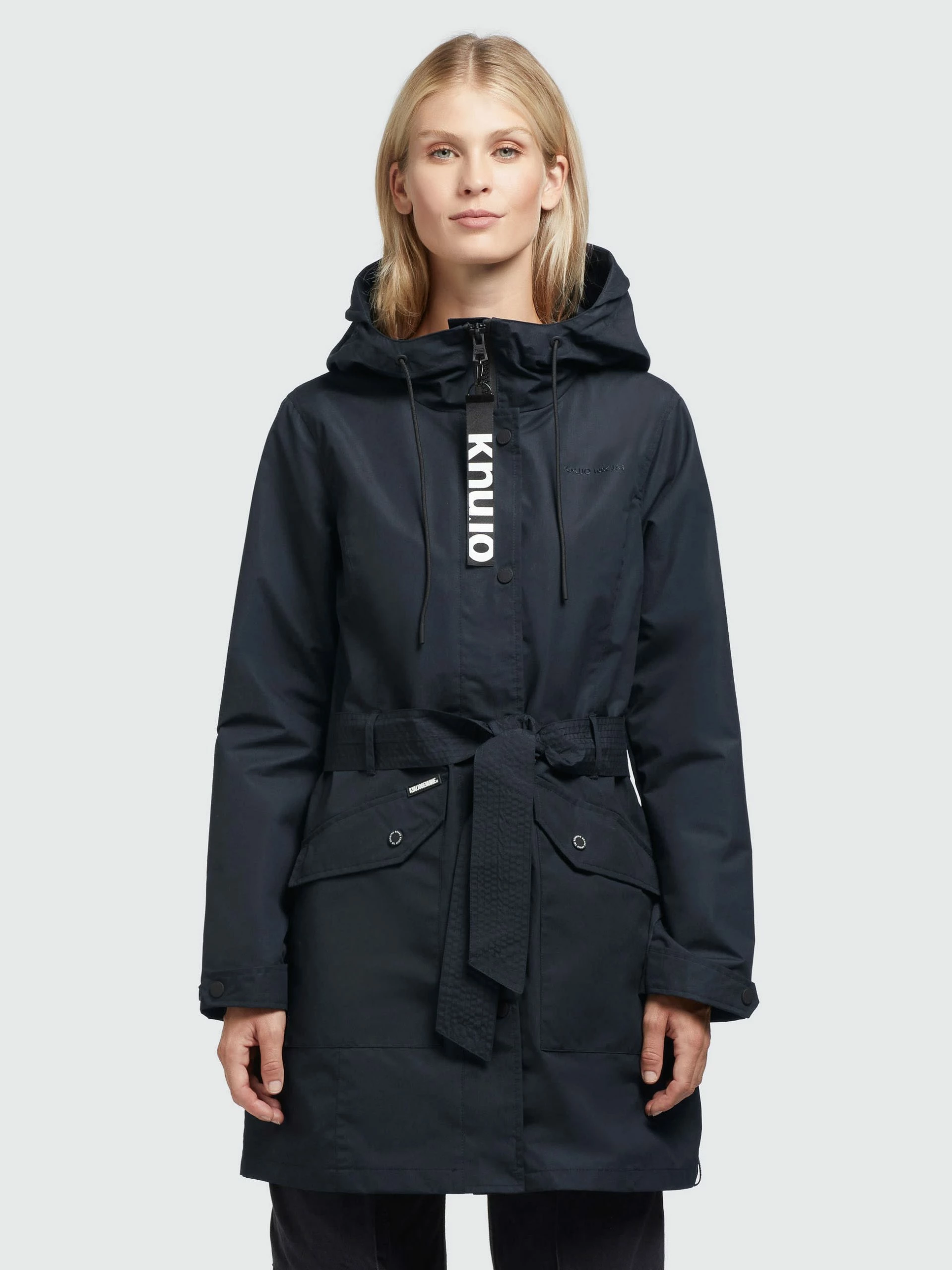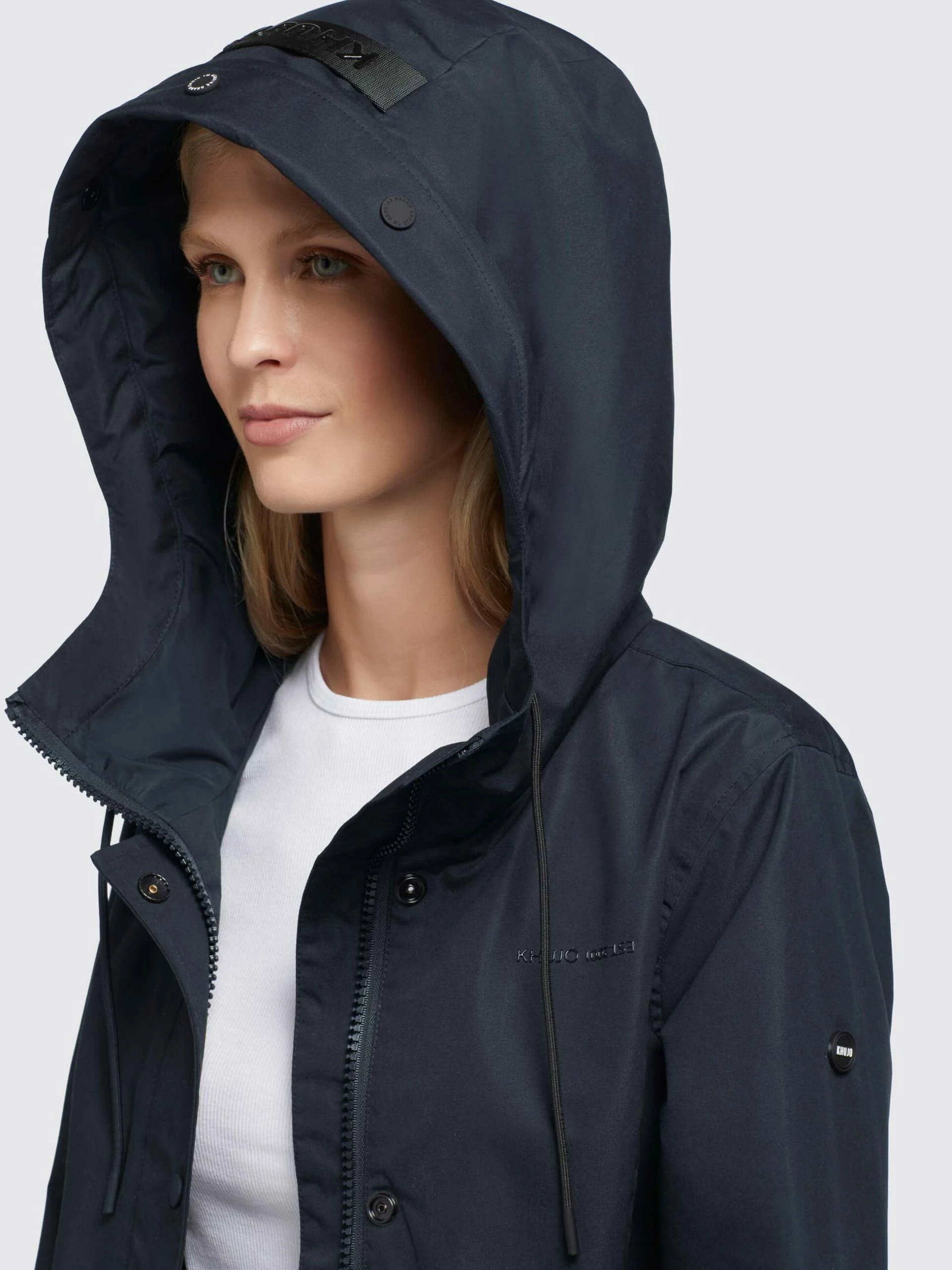 – hoch schließende Kapuze mit Kordelzug