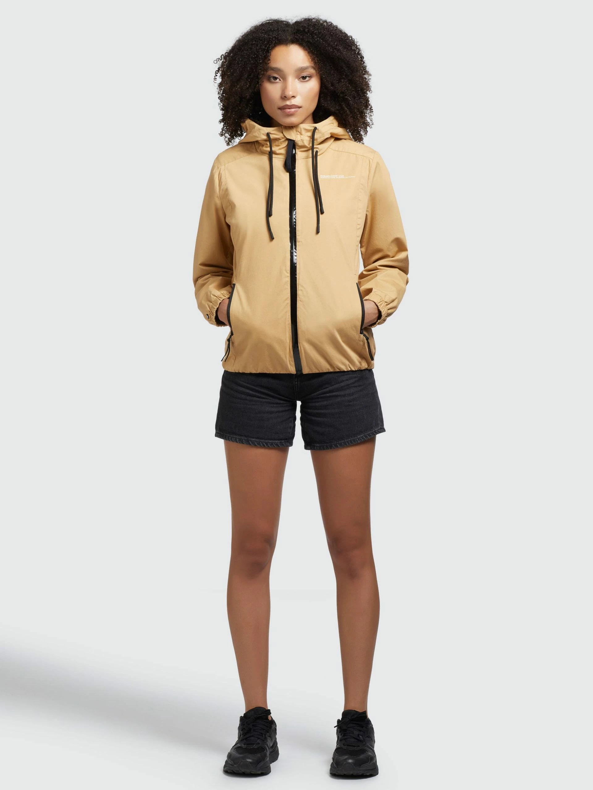 – hoch schließende Kapuze mit Kordelzug
